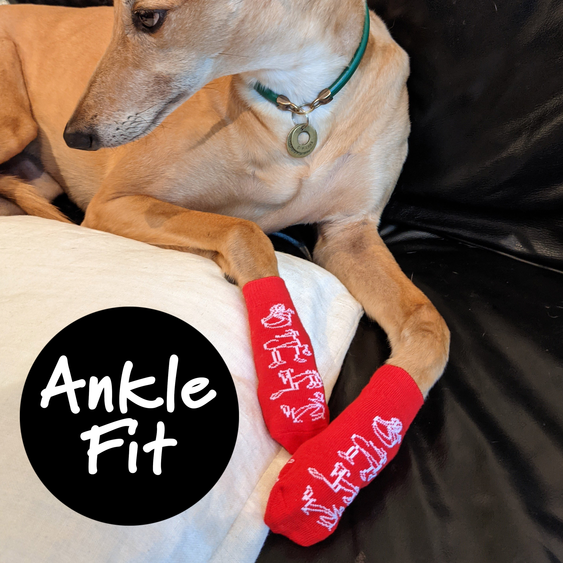 They come in three lengths to fit every Sighthound; Ankle for Whippets and Crew for Greyhounds. If you really want to impress, step out in the Knee Highs and look every part the cross-fit enthusiast!