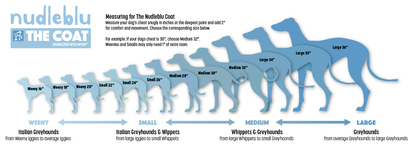 Nudleblu is designed for sighthounds. That means deep chests, slim waists and long legs. The most important measurement is chest circumference. If the chest fits, the back length will sit where it should.